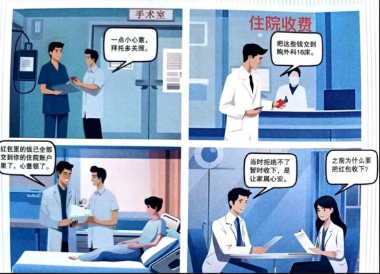 《医疗机构工作人员廉洁从业九项准则》(以下简称《九项准则》)规定:“不准收受患方红包。”医务人员应该恪守医德、严格自律,拒收红包,树立良好医德医风,让“白衣天使”实至名归。