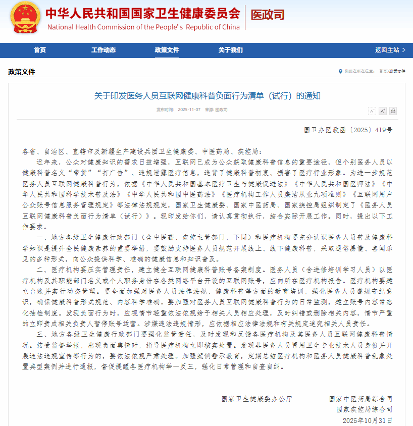 为指导医疗机构和医务人员规范开展互联网健康科普,更好满足人民群众健康需求,国家卫生健康委、国家中医药局、国家疾控局于11月7日联合印发《关于医务人员互联网健康科普负面行为清单(试行)的通知》,聚焦当前互联网健康科普中存在的问题,提出了十条负面行为清单。