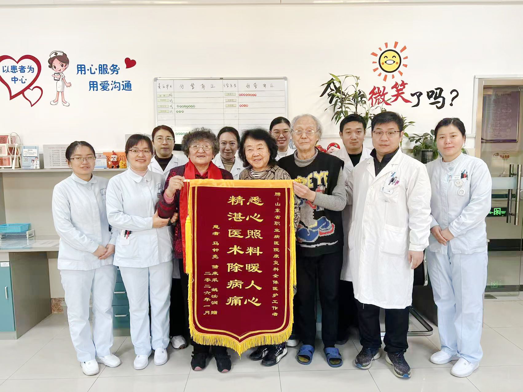 近日,山东第一医科大学附属职业病医院康复科暖意融融,三位高龄脑卒中后遗症患者亲手将一面书写着感激之语的锦旗,送到了科室医护人员手中,以此表达他们深切的谢意。