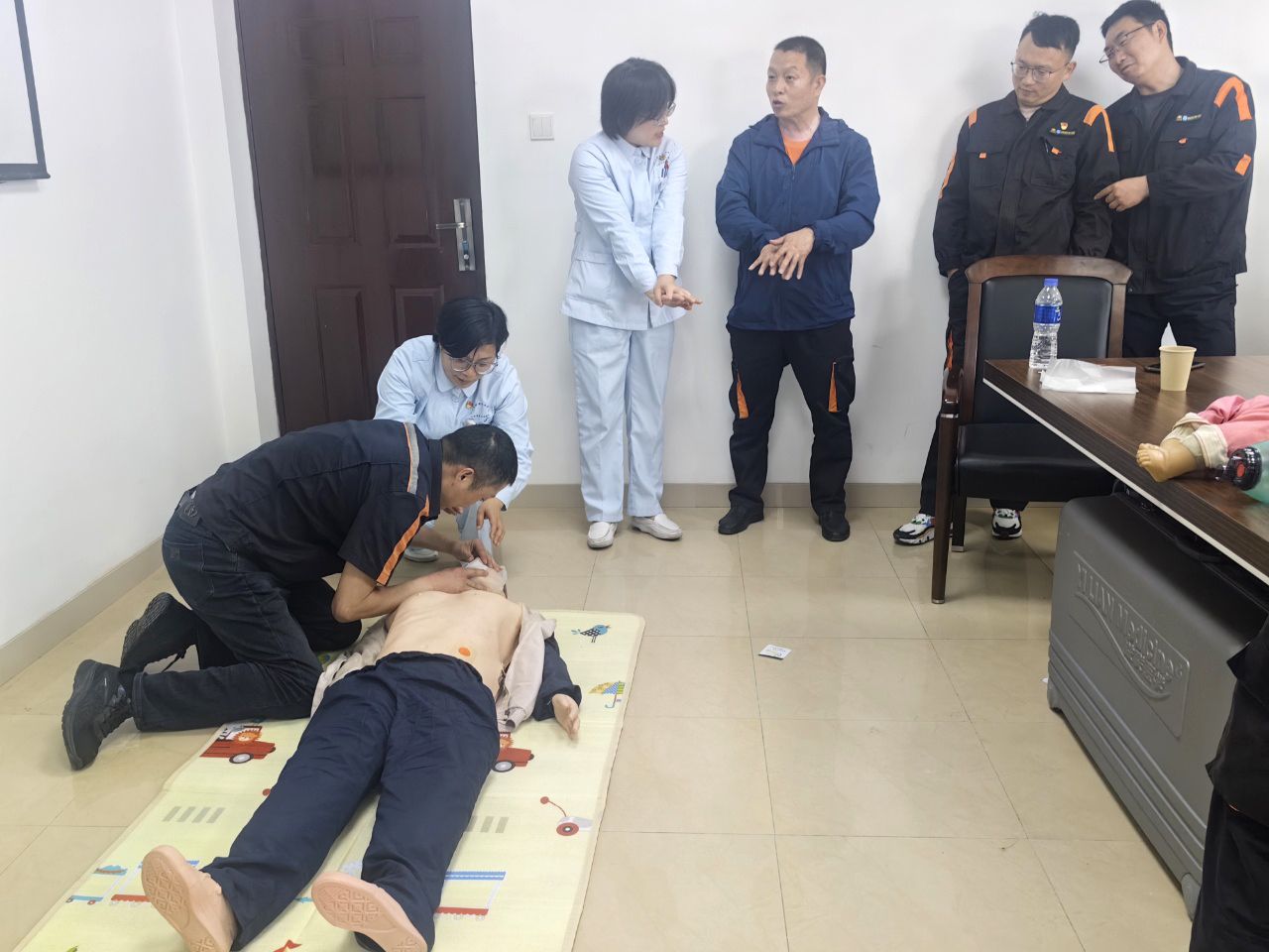 在实操环节,医疗团队利用人体模型进行标准化示范。随后,参训职工在培训人员指导下逐一进行模拟演练。培训人员对按压姿势、力度控制等关键环节予以手把手纠正,确保参训人员掌握规范动作,达到“敢救、会救、能救”的培训目标。