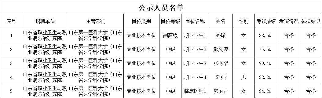 根据事业单位公开招聘有关规定,按照2025年7月18日发布的岗位招聘计划,山东省职业卫生与职业病防治研究院组织完成了公开招聘工作人员的面试、考察、体检等工作,现对拟聘用人员进行公示。公示期为5个工作日,自2025年12月2日至2025年12月8日。公示期间,如对公示人选有异议,请及时反映。