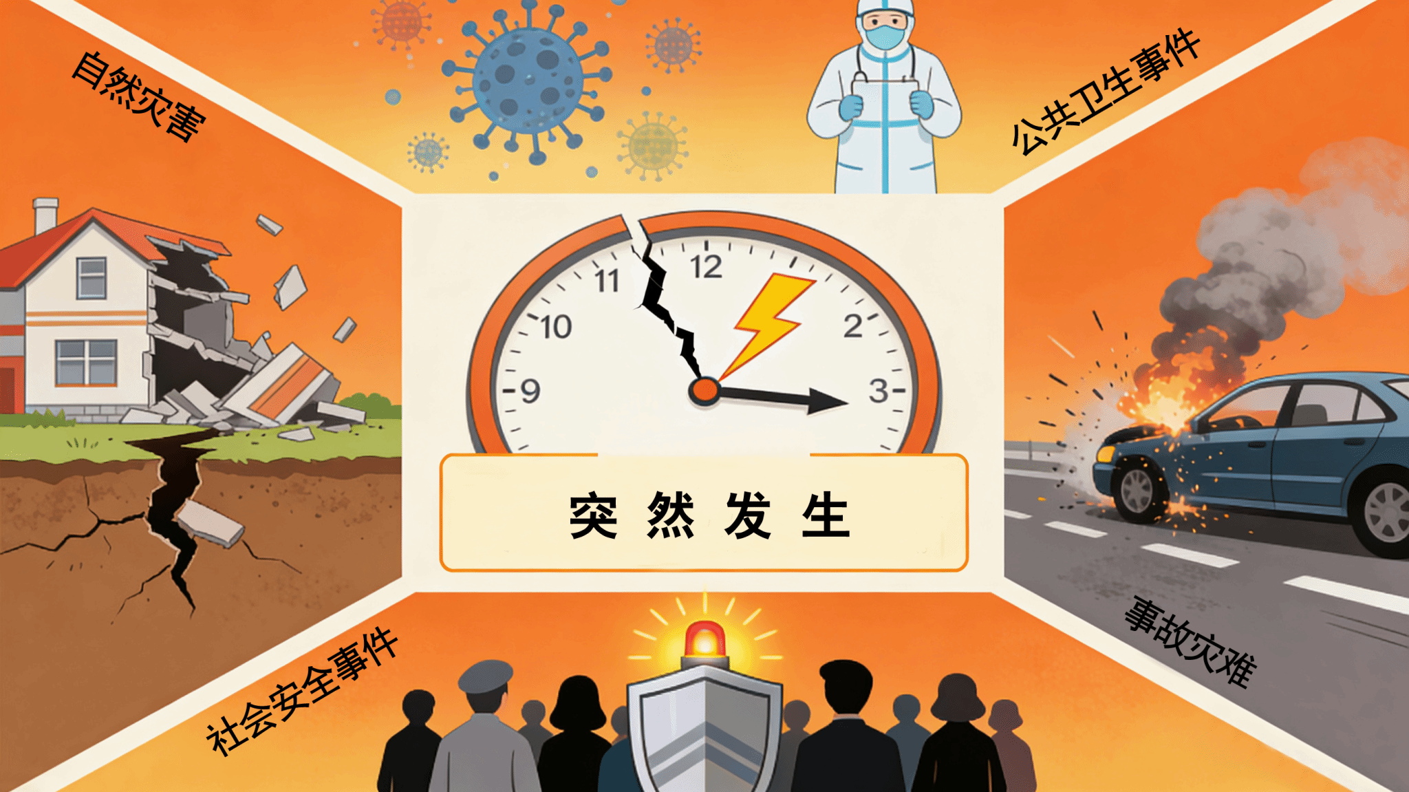 突发事件:突然发生,造成或可能造成严重社会危害,需采取应急处置措施予以应对的自然灾害、事故灾难、 公共卫生事件和社会安全事件。